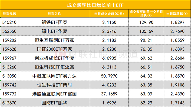 从成交额环比增长前十的ETF来看,钢铁ETF国泰(515210)成交额环比增长129%位居首位;绿电ETF华夏(562550)成交额环比增长105%位居次席。