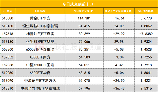 从成交额前十的ETF来看,黄金ETF华安(518880)成交额位居首位,恒生科技ETF华泰柏瑞(513130)成交额位居次席。