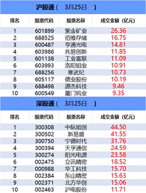 从沪股通前十大成交个股来看,紫金矿业位居首位;佰维存储和亨通光电分居二、三位。