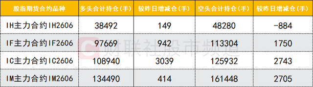 四大期指主力合约中,IF、IC、IM合约多空双方均加仓,IM合约空头加仓数量较多。