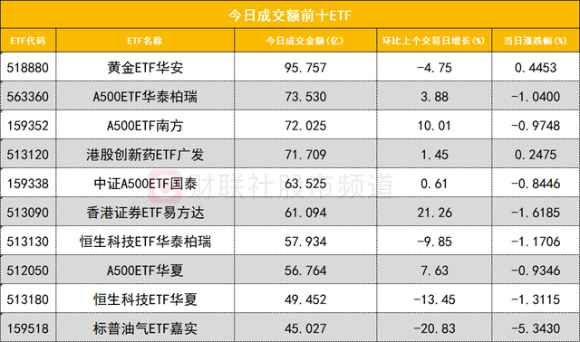 从成交额前十的ETF来看,黄金ETF华安(518880)成交额位居首位,A500ETF华泰柏瑞(563360)成交额位居次席。