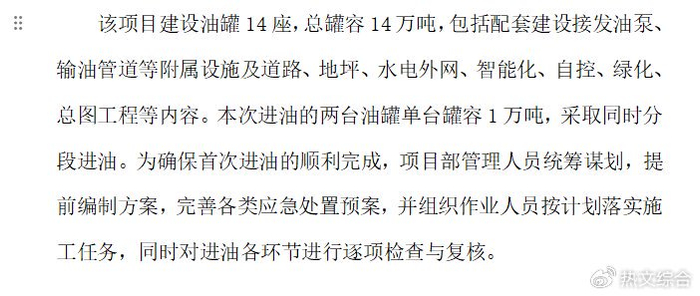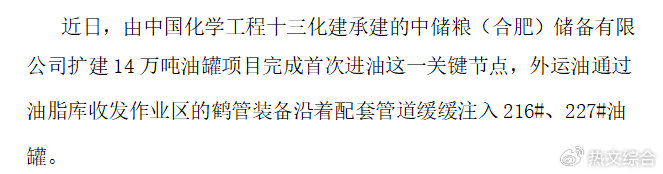 中国化学工程十三化建中储粮(合肥)油罐项目完成首次进油