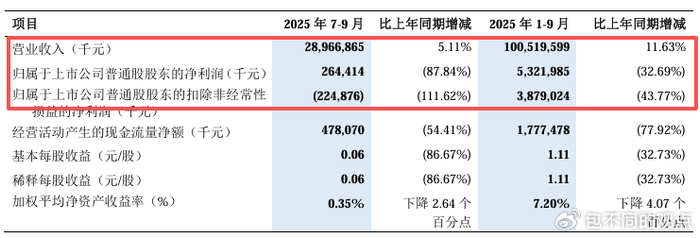 单看第三季度,公司营收为289.67亿元,同比增长5.11%;归母净利润为2.64亿元,同比暴跌87.84%;扣非净利润为-2.25亿元,相较于去年的19.35亿元暴跌111.62%。公司陷入增收不增利的局面,盈利能力大幅下降。