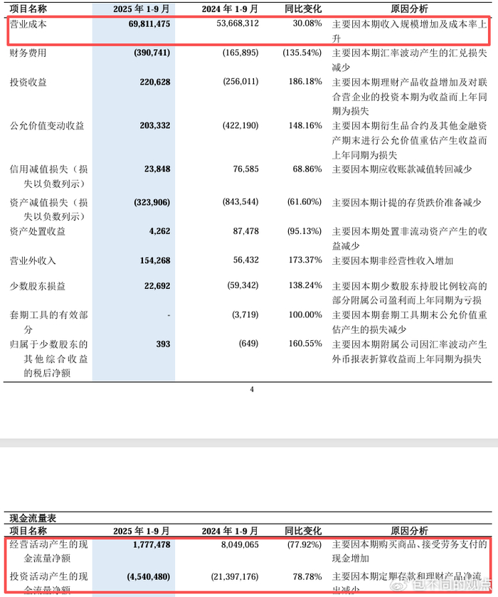 此外,公司前三季度营业成本达698.11亿元,同比增加30.08%;经营现金流量净额相较于去年同期的80.49亿元减少77.92%至17.77亿元。营业成本增加远超营收增速,现金流承压,公司称主要因本期购买商品、接受劳务支付的现金增加和成本率上升导致。