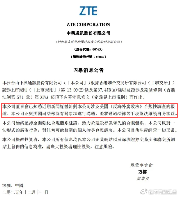 中兴通讯发布公告称,董事会已知悉近期新闻媒体针对公司涉及美国《反海外腐败法》合规性调查的报道;正与美国司法部就有关事项进行沟通,并将通过法律等手段坚决维护自身权益。11月11日午间,中兴通讯紧急发布公告,称公司董事会已知悉近期新闻媒体针对本公司涉及美国《反海外腐败法》合规性调查的报道,正与美国司法部就有关事项进行沟通,并将通过法律等手段坚决维护自身权益。