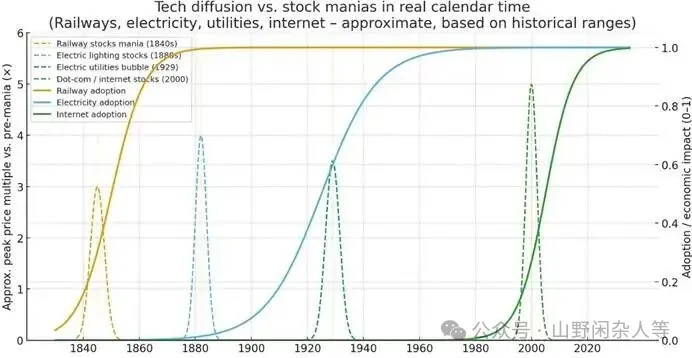 听上去很有道理。但今天这篇文章想说的是:这个论点背后的逻辑,正在悄悄失效——它已经救不了估值了。因为技术普及和股价走势,本质上是两条并不同步的曲线,技术可以很早成熟,股价却已经“来晚了”——晚到情绪开始翻转,晚到开始往下砸,过去150年,每一轮大科技革命——电力、铁路、光纤、互联网、智能手机,都是这个死套路。