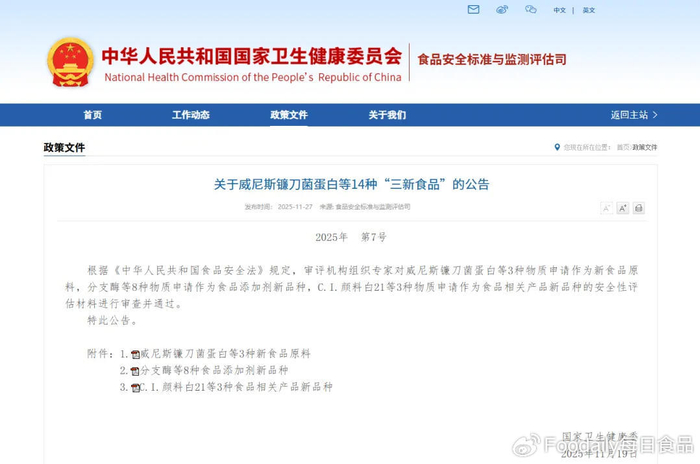 11月27日,卫健委食品安全标准与监测评估司发布2025年第7号公告,批准威尼斯镰刀菌蛋白、接骨木莓花色苷、油橄榄果多酚为新食品原料。