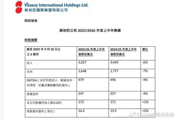 8、收入达29.4亿元!维他奶国际发布2025年中期业绩