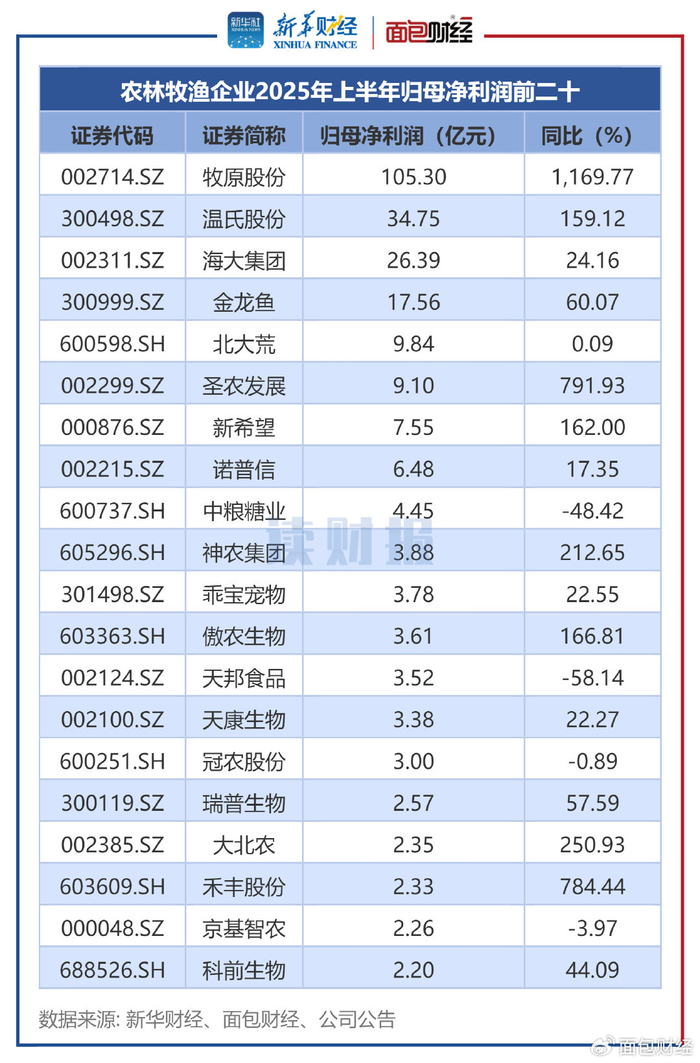 金龙鱼、牧原股份、海大集团的营收规模居前,2025年上半年分别实现收入1156.82亿元、764.63亿元、588.31亿元。增速方面,贤丰控股、新赛股份等4家公司增速超过100%,罗牛山、雪榕生物等12家公司收入降幅超过20%。