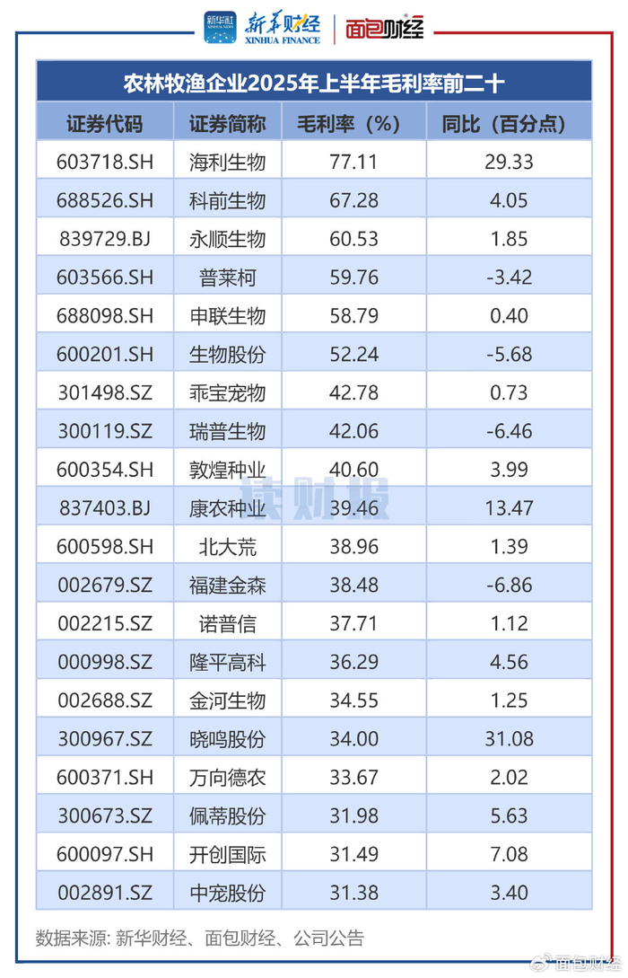 毛利率方面,A股117家农林牧渔企业2025年上半年平均毛利率约17.93%、中位数为13.86%,同比均出现小幅上涨。其中,海利生物上半年毛利率达77.11%,科前生物、永顺生物超过60%。