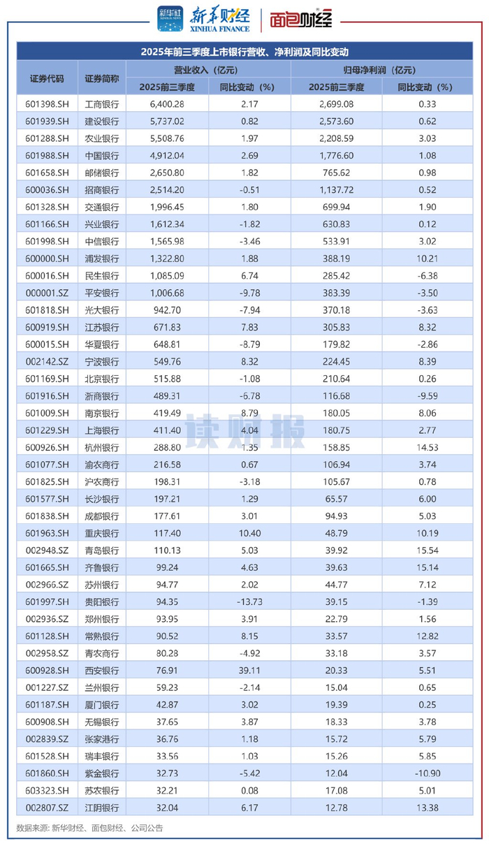 近期,随着2025年三季报披露结束,新华财经及面包财经研究员对A股42家上市银行业绩及核心监管指标进行了整理。