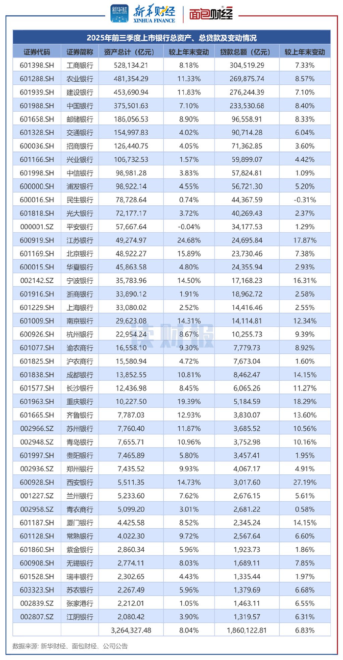 截至2025年三季末,上市银行总资产合计326.43万亿元,较上年末增长8.04%;总贷款合计186.01万亿元,较上年末增长6.83%。