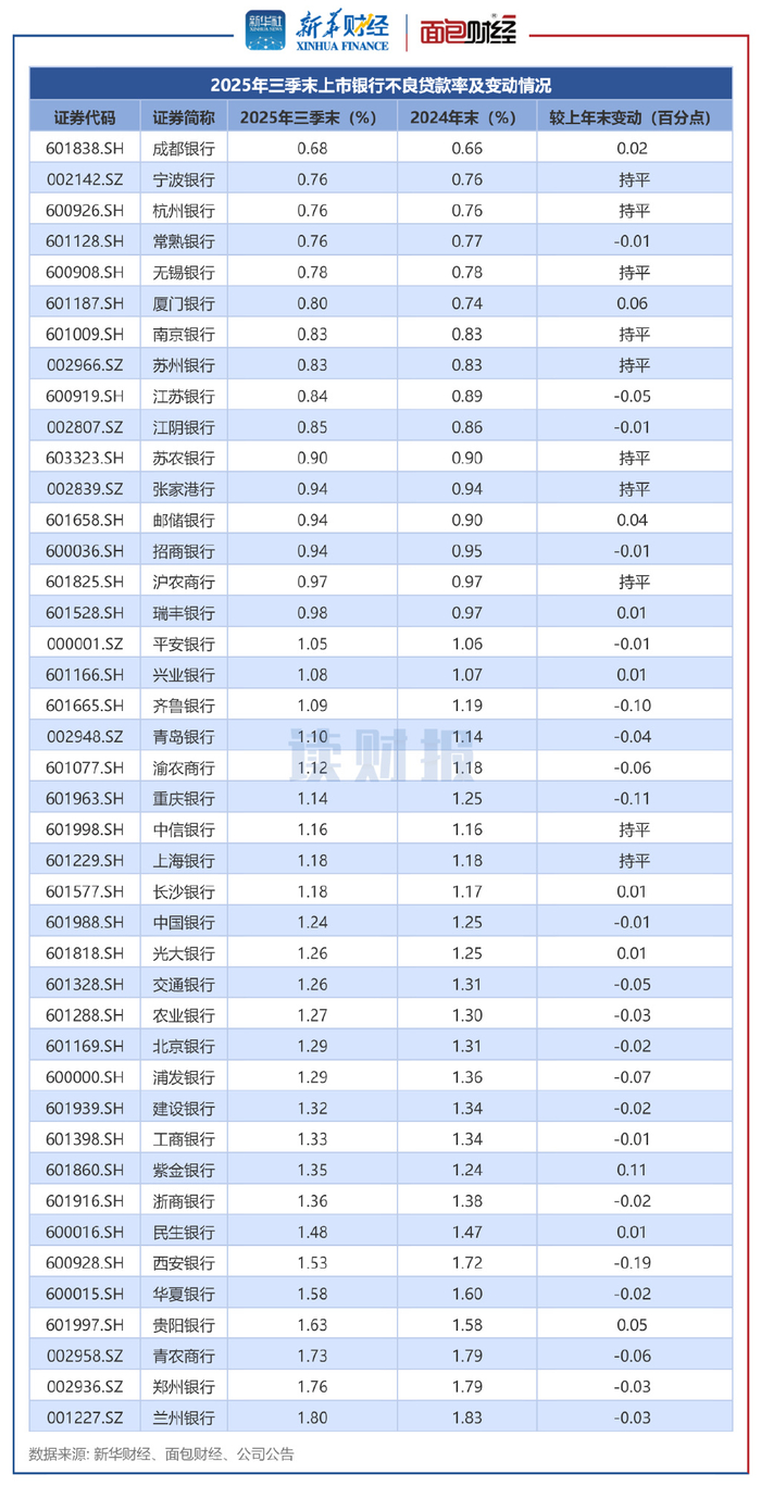 图3:2025年三季末上市银行不良贷款率及变动情况