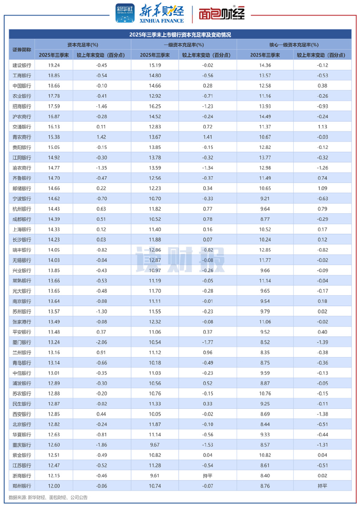 数据显示,截至2025年9月末,上市银行的资本充足率指标普遍出现下降。