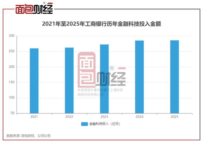 金融科技的领先优势离不开工商银行多年的持续投入。财报数据显示,工商银行金融科技投入金额持续攀升,2025年金融科技投入达到285.88亿元。