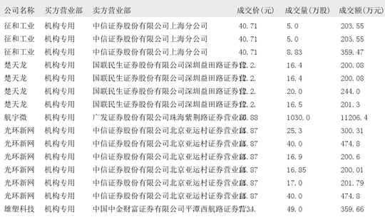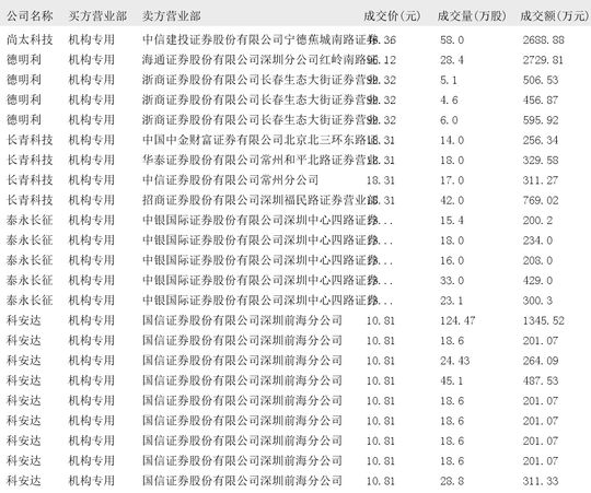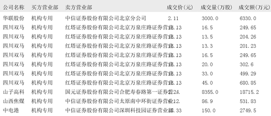 今日大宗交易榜单中出现机构买入席位的个股为:华联股份、四川双马、山子高科、山西焦煤、中电港、尚太科技、德明利、长青科技、泰永长征、科安达、征和工业、楚天龙、航宇微、光环新网、雄塑科技、易瑞生物、肇民科技、朗坤科技、圆通速递、徕木股份、盛洋科技、德邦科技、长盈通、科美诊断。