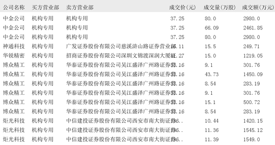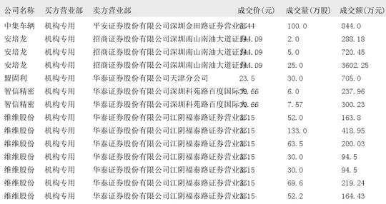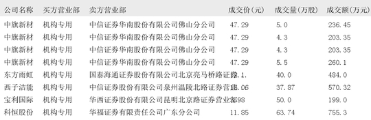 今日大宗交易榜单中出现机构买入席位的个股为:中旗新材、东方雨虹、西子洁能、宝利国际、科恒股份、天利科技、迦南科技、四方精创、斯迪克、申菱环境、中集车辆、安培龙、盟固利、智信精密、维维股份、中金公司、神通科技、华锐精密、博众精工、炬光科技、云天励飞、国盛智科、达梦数据。