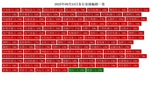 今日涨幅居前的行业有:半导体(4.12%)、矿物制品(3.37%)、园区开发(3.31%)、化工机械(2.78%)、纺织机械(2.68%)、摩托车(2.49%)、染料涂料(2.41%)、化工(2.34%)、软件服务(2.33%)、商品城(2.26%)。