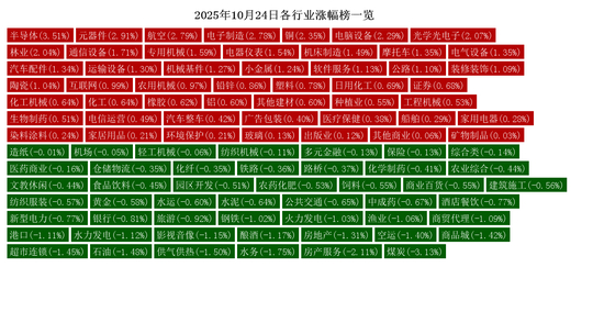 今日涨幅居前的行业有:半导体(3.51%)、元器件(2.91%)、航空(2.79%)、电子制造(2.78%)、铜(2.35%)、电脑设备(2.29%)、光学光电子(2.07%)、林业(2.04%)、通信设备(1.71%)、专用机械(1.59%)。