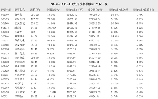 2025年10月24日盘后龙虎榜公开信息中,有48支股票出现了机构的身影。其中,有20支股票出现了机构买入,28支股票出现了机构卖出。