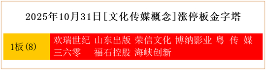 一共有8支个股涨停。其中,欢瑞世纪、山东出版、荣信文化、博纳影业、粤 传 媒、三六零、福石控股、海峡创新1板。