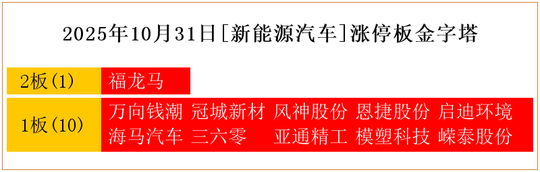 一共有11支个股涨停。其中,福龙马2板;万向钱潮、冠城新材、风神股份、恩捷股份、启迪环境、海马汽车、三六零、亚通精工、模塑科技、嵘泰股份1板。