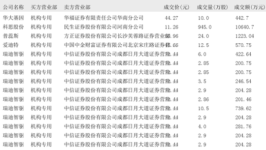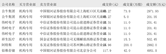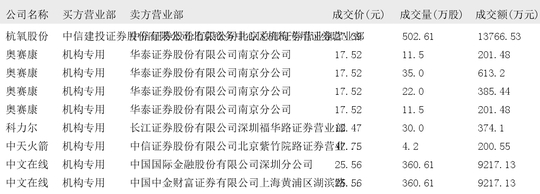 今日大宗交易榜单中出现机构买入席位的个股为:杭氧股份、奥赛康、科力尔、中天火箭、中文在线、华大基因、科思股份、普蕊斯、爱迪特、瑞迪智驱、公牛集团、伟时电子、祥生医疗、阿特斯、佰维存储、国光电气。