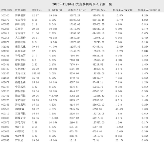 2025年11月04日盘后龙虎榜公开信息中,有60支股票出现了机构的身影。其中,有29支股票出现了机构买入,31支股票出现了机构卖出。