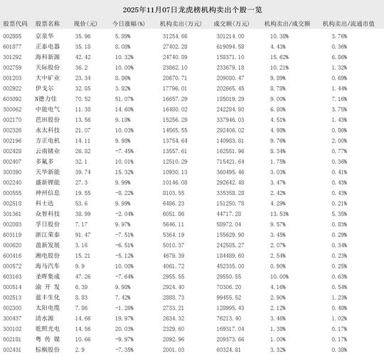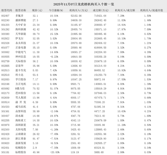 2025年11月07日盘后龙虎榜公开信息中,有63支股票出现了机构的身影。其中,有31支股票出现了机构买入,32支股票出现了机构卖出。