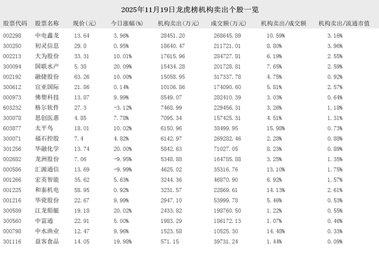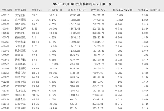 2025年11月19日盘后龙虎榜公开信息中,有43支股票出现了机构的身影。其中,有22支股票出现了机构买入,21支股票出现了机构卖出。