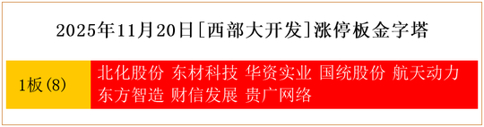 一共有8支个股涨停。其中,北化股份、东材科技、华资实业、国统股份、航天动力、东方智造、财信发展、贵广网络1板。