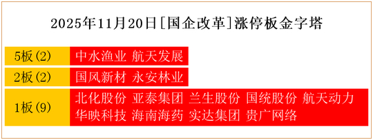 一共有13支个股涨停。其中,中水渔业、航天发展5板;国风新材、永安林业2板;北化股份、亚泰集团、兰生股份、国统股份、航天动力、华映科技、海南海药、实达集团、贵广网络1板。