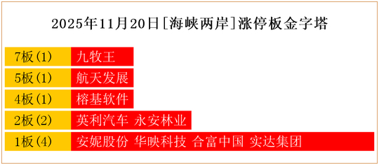 一共有9支个股涨停。其中,九牧王7板;航天发展5板;榕基软件4板;英利汽车、永安林业2板;安妮股份、华映科技、合富中国、实达集团1板。