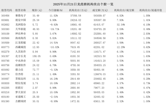 2025年11月21日盘后龙虎榜公开信息中,有41支股票出现了机构的身影。其中,有20支股票出现了机构买入,21支股票出现了机构卖出。