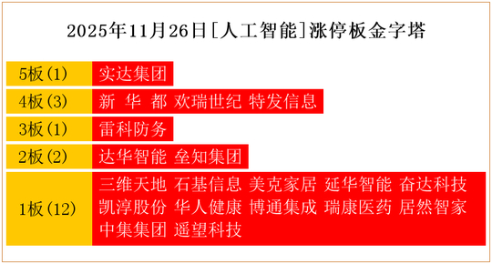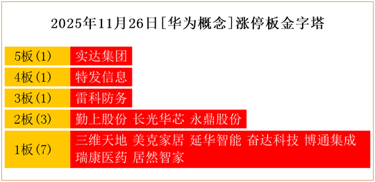 一共有13支个股涨停。其中,实达集团5板;特发信息4板;雷科防务3板;勤上股份、长光华芯、永鼎股份2板;三维天地、美克家居、延华智能、奋达科技、博通集成、瑞康医药、居然智家1板。