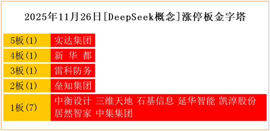 一共有11支个股涨停。其中,实达集团5板;新 华 都4板;雷科防务3板;垒知集团2板;中衡设计、三维天地、石基信息、延华智能、凯淳股份、居然智家、中集集团1板。