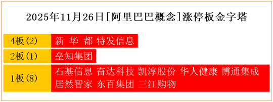 一共有11支个股涨停。其中,新 华 都、特发信息4板;垒知集团2板;石基信息、奋达科技、凯淳股份、华人健康、博通集成、居然智家、东百集团、三江购物1板。