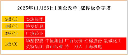 一共有12支个股涨停。其中,实达集团5板;特发信息4板;广济药业3板;华塑控股、中恒集团、广百股份、红棉股份、氯碱化工、英特集团、青山纸业、特 力A、上海机电1板。