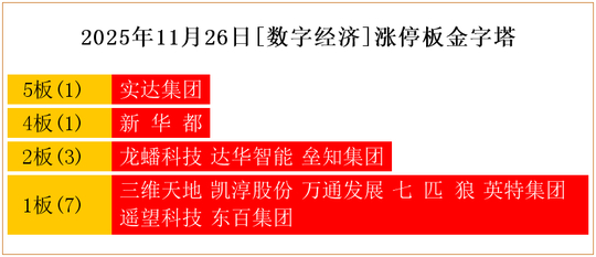 一共有12支个股涨停。其中,实达集团5板;新 华 都4板;龙蟠科技、达华智能、垒知集团2板;三维天地、凯淳股份、万通发展、七 匹 狼、英特集团、遥望科技、东百集团1板。