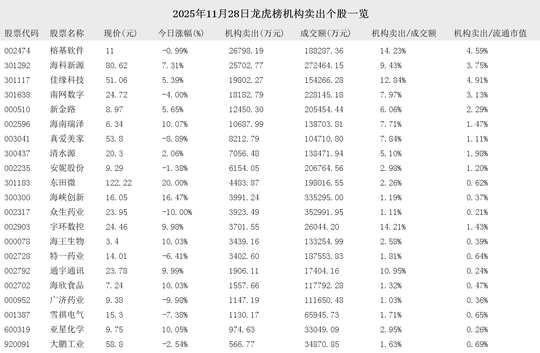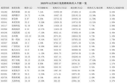 2025年11月28日盘后龙虎榜公开信息中,有43支股票出现了机构的身影。其中,有21支股票出现了机构买入,22支股票出现了机构卖出。