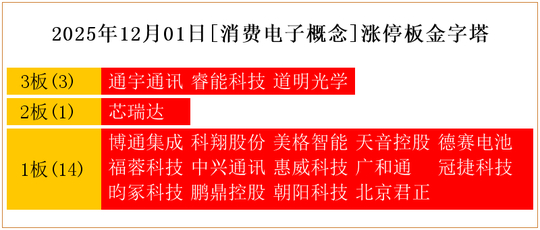 一共有18支个股涨停。其中,通宇通讯、睿能科技、道明光学3板;芯瑞达2板;博通集成、科翔股份、美格智能、天音控股、德赛电池、福蓉科技、中兴通讯、惠威科技、广和通、冠捷科技、昀冢科技、鹏鼎控股、朝阳科技、北京君正1板。