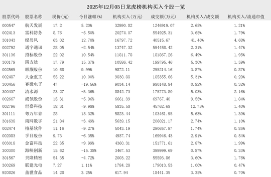 2025年12月03日盘后龙虎榜公开信息中,有49支股票出现了机构的身影。其中,有21支股票出现了机构买入,28支股票出现了机构卖出。