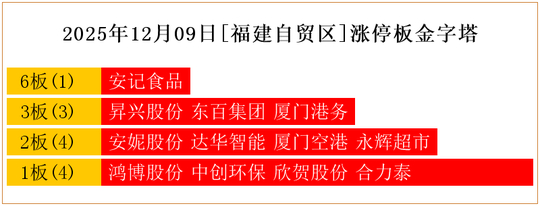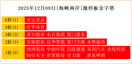 一共有12支个股涨停。其中,安记食品6板;昇兴股份、东百集团、厦门港务3板;安妮股份、达华智能、厦门空港、永辉超市2板;鸿博股份、中创环保、欣贺股份、合力泰1板。