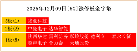 一共有11支个股涨停。其中,骏亚科技5板;中瓷电子、达华智能2板;陕西华达、雷科防务、跃岭股份、德科立、泰永长征、超声电子、合力泰、天通股份1板。