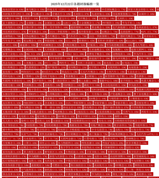 今日涨幅居前的题材概念有:海南自贸区(9.63%)、赛马概念(4.55%)、跨境支付(CIPS)(4.17%)、自由贸易港(3.94%)、中芯国际概念(3.77%)、国家大基金持股(3.4%)、铜缆高速连接(3.36%)、共封装光学(CPO)(3.2%)、F5G概念(3.15%)、存储芯片(3.0%)。