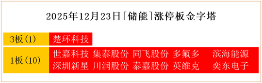 一共有11支个股涨停。其中,楚环科技3板;世嘉科技、集泰股份、同飞股份、多氟多、滨海能源、深圳新星、川润股份、泰嘉股份、英维克、奕东电子1板。