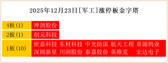 一共有12支个股涨停。其中,神剑股份4板;创元科技2板;世嘉科技、东材科技、中光防雷、航天工程、章源钨业、深圳新星、川润股份、泰嘉股份、英维克、宏达电子1板。