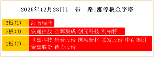 一共有12支个股涨停。其中,海南瑞泽3板;安通控股、圣晖集成、创元科技、利柏特2板;世嘉科技、集泰股份、国风新材、联发股份、中百集团、泰嘉股份、德力股份1板。
