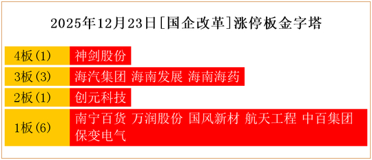 一共有11支个股涨停。其中,神剑股份4板;海汽集团、海南发展、海南海药3板;创元科技2板;南宁百货、万润股份、国风新材、航天工程、中百集团、保变电气1板。