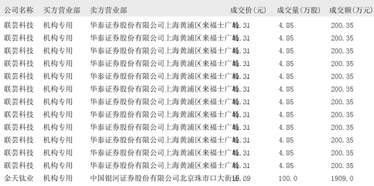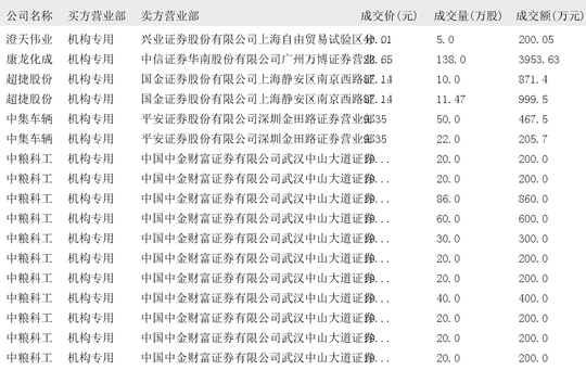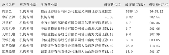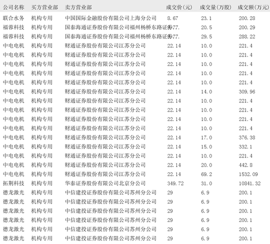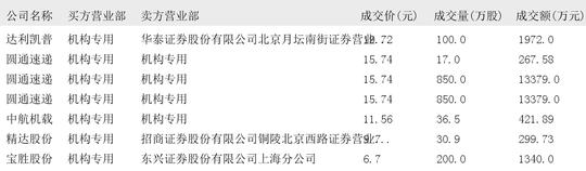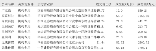 今日大宗交易榜单中出现机构买入席位的个股为:长江材料、智微智能、海康威视、立讯精密、江苏国信、奥瑞金、中矿资源、万里石、天银机电、江龙船艇、澄天伟业、康龙化成、超捷股份、中集车辆、中粮科工、广立微、家联科技、五洲医疗、盟固利、无线传媒、达利凯普、圆通速递、中航机载、精达股份、宝胜股份、联合水务、福蓉科技、中电电机、拓荆科技、德龙激光、联芸科技、金天钛业。